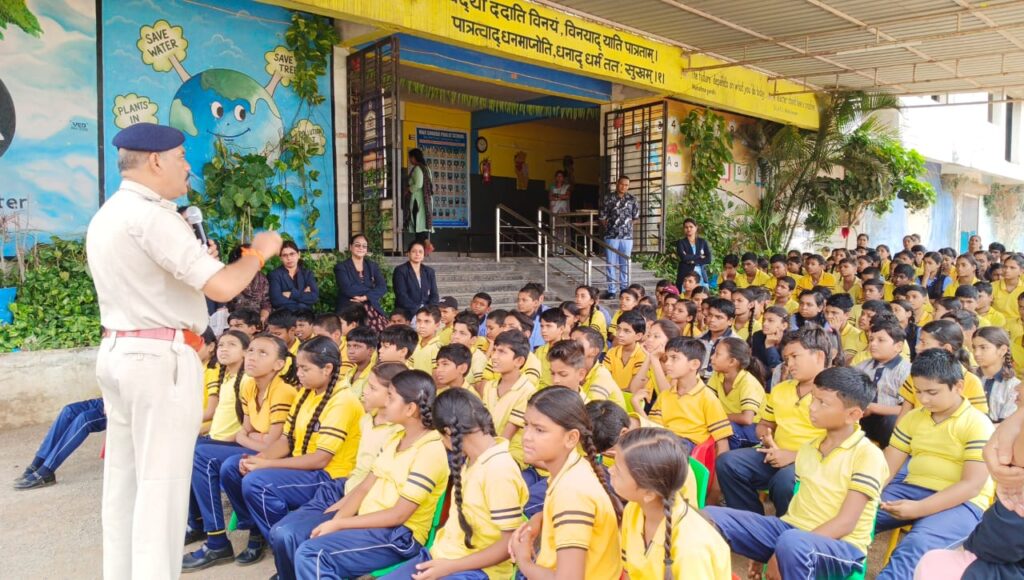 सामुदायिक यातायात पुलिस के तहत यातायात जागरूकता अभियान चलाया जा रहा है। इसके तहत शनिवार को रायपुर स्थित माँ शारदा हायर सेकेंडरी पब्लिक स्कूल काठडीह रोड मठपुरेना में ट्रैफिक अधिकारियों ने स्कूल के छात्र-छात्राओं को ट्रैफिक नियमों के बारे में जानकारी दी।