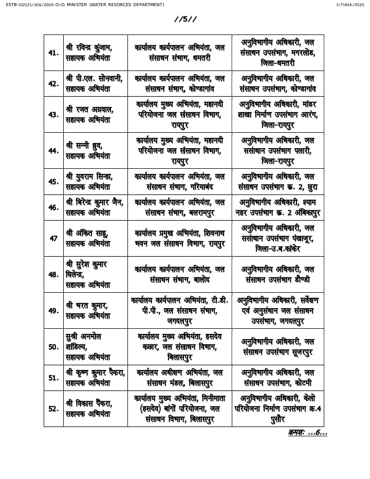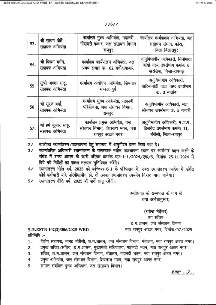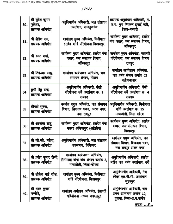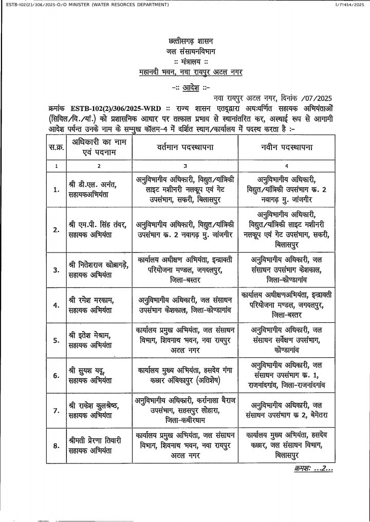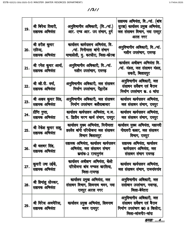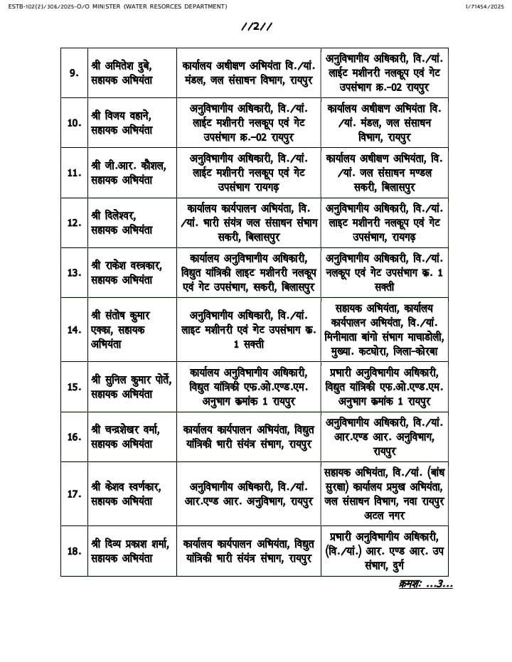 Chhattisgarh फिर थोक में सहायक अभियंताओं का ट्रांसफर, सूची जारी Tushar Sahu July 15, 2025 0 रायपुर. जल संसाधन विभाग में बड़े पैमाने पर ट्रांसफर किए गए हैं। विभाग के सहायक अभियंताओं की सूची जारी की गई। देखिए सूची कहां किसका हुआ तबादला। Post Navigation Previous रेलवे के बड़े कारोबारी और दुर्ग के एक होटल में ईडी का छापाNext कांग्रेस का भाजपा पर पोस्टर वार, मूणत को बताया भाजपा का भस्मासुर More Stories Chhattisgarh डिजिटल डेमोक्रेसी डायलॉग में मुख्यमंत्री का आह्वान: क्रिएटर्स दिखाएं बदलते छत्तीसगढ़ की नई पहचान Tushar Sahu April 18, 2026 0 Chhattisgarh अम्बेडकर जयंती पर मुख्यमंत्री ने किया नमन, सामाजिक न्याय के संदेश को अपनाने का आह्वान Tushar Sahu April 14, 2026 0 Chhattisgarh चंडी देवी मंदिर में चोरी, सोने के आभूषण पार, चांदी को हाथ तक नहीं लगाया Tushar Sahu April 14, 2026 0 Leave a Reply Cancel replyYour email address will not be published. Required fields are marked *Comment * Name * Email * Website Save my name, email, and website in this browser for the next time I comment.