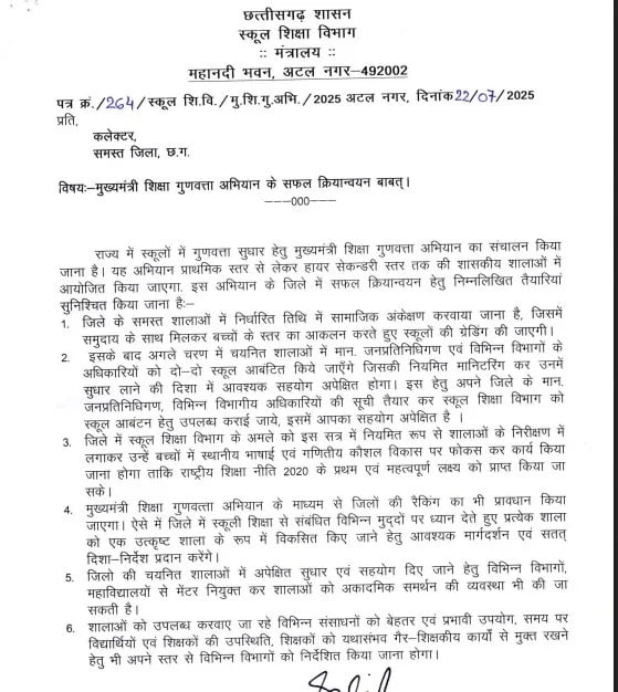 राज्य के स्कूलों में मुख्यंत्री शिक्षा गुणवत्ता अभियान शुरू किया जाएगा। इस संबंध में स्कूल शिक्षा विभाग ने सभी जिलों के कलेक्टरों को पत्र जारी किया है। यह अभियान प्राथमिक स्तर से लेकर हायर सेकंडरी स्तर तक की शासकीय शालाओं में आयोजित किया जाएगा।