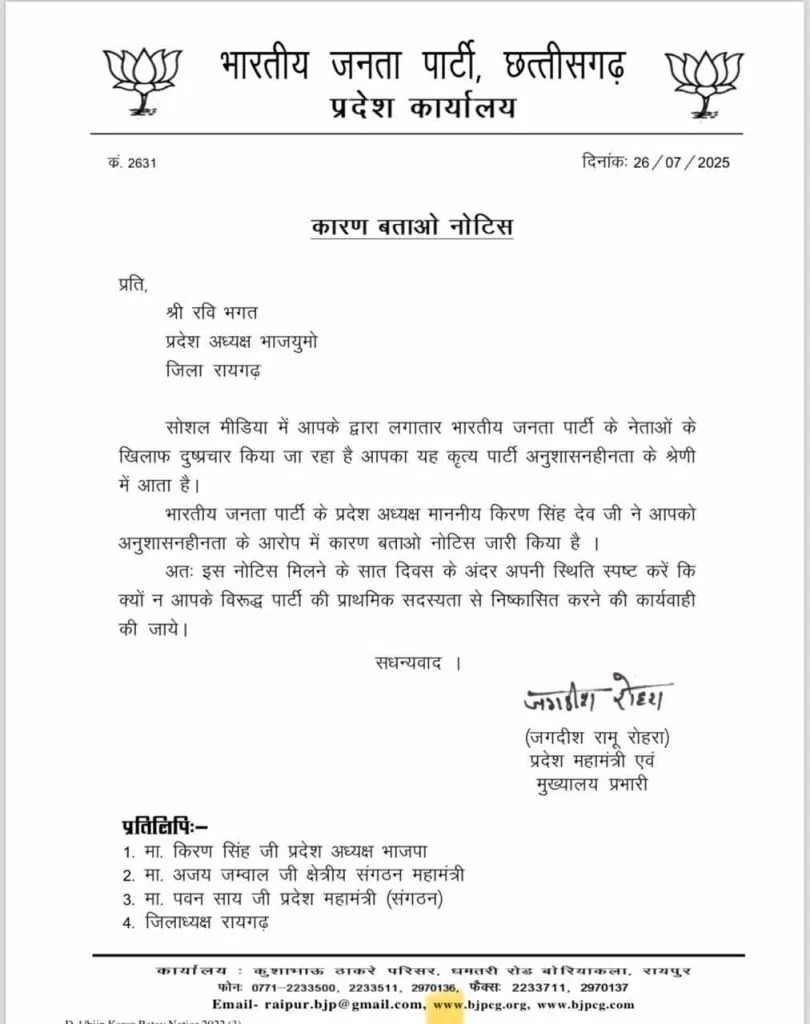 भारतीय जनता युवा मोर्चा के प्रदेश अध्यक्ष रविभगत को भाजपा प्रदेश अध्यक्ष ने नोटिस जारी कर सात दिन में जवाब मांगा है। जवाब नहीं देने पर पार्टी से निष्कासन की कार्रवाई की जाएगी।