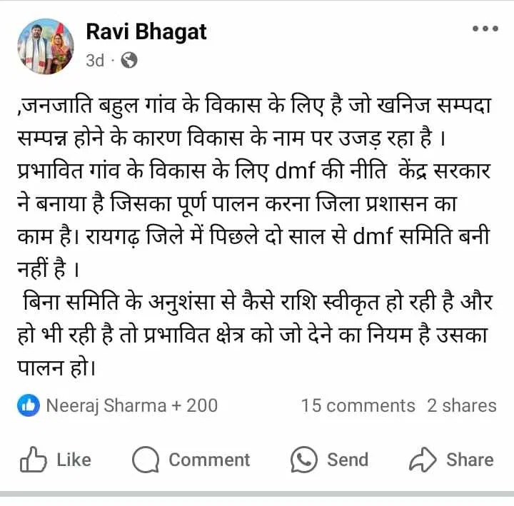 बता दें कि पिछले दिनों भाजयुमो प्रदेश अध्यक्ष रवि भगत ने DMF पैसा जारी नहीं करने को लेकर सोशल मीडिया में वीडियो पोस्ट किया था। उन्होंने अपील की थी कि डीएमएफ की राशि गांव में ही खर्च करने के लिए सरकार को पहल करनी चाहिए, चूंकि सड़क, जल सहित अन्य कई विकास कार्य है, जो इस राशि से काफी हद तक पूरे हो सकते हैं।