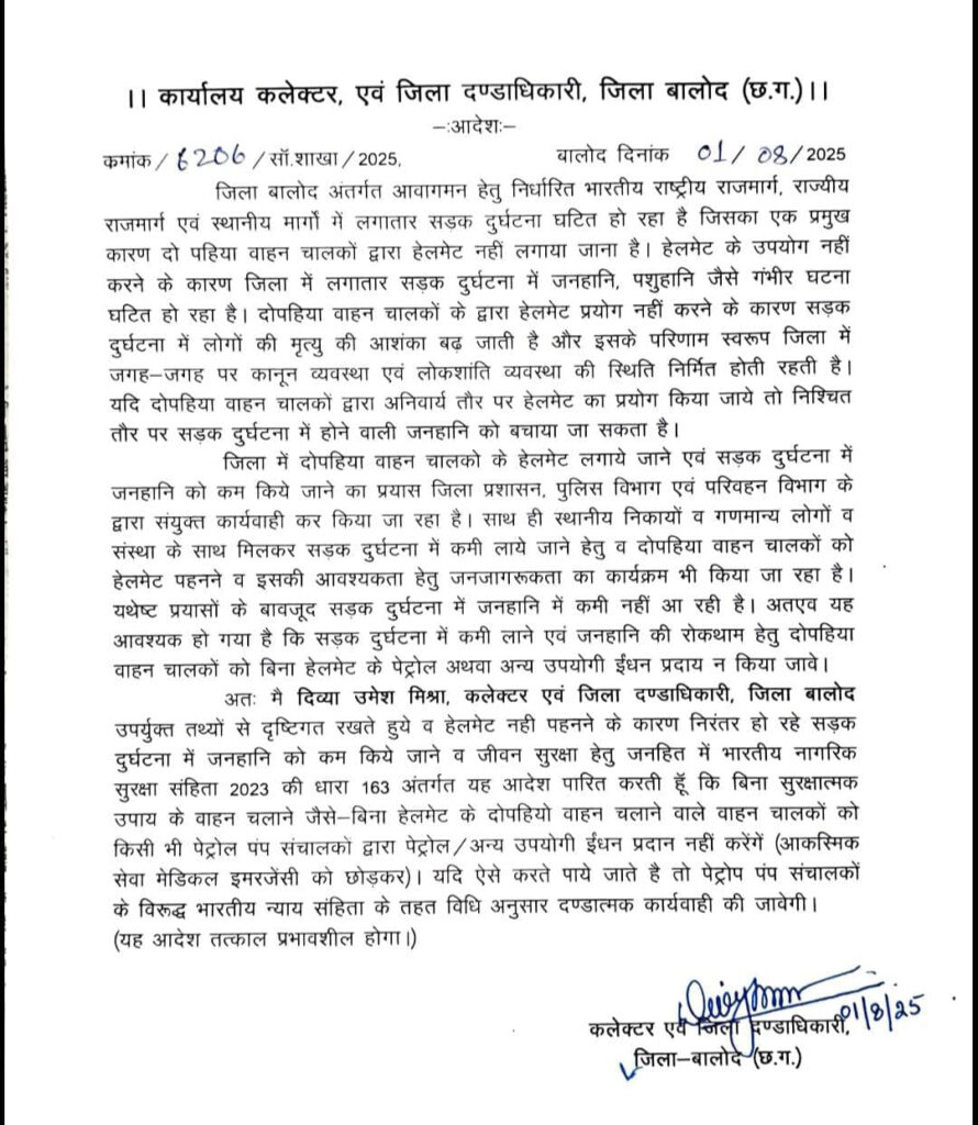 कलेक्टर दिव्या उमेश मिश्रा ने खासकर दोपहिया वाहन चालकों के लिए कड़ा फरमान जारी किया गया है। जारी आदेश में कहा है कि वाहन चलाते समय हेलमेट पहनना अनिवार्य है। अन्यथा किसी भी पेट्रोल पंप पर पेट्रोल नहीं दिया जाएगा। इसलिए दाे पहिया वाहन चलाते समय हेलमेट अनिवार्य रूप से पहने और अपना जीवन सुरक्षित रखे।