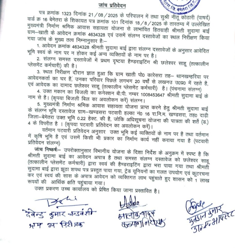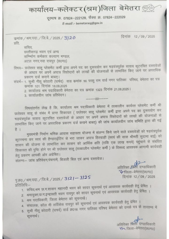 Chhattisgarh प्लेसमेंट कर्मचारी ने किया पद का दुरुपयोग,दर्ज होगा मामला Tushar Sahu September 20, 2025 0 रायपुर। श्रम विभाग के एक कर्मचारी ने पद का दुरुपयोग कर अपात्र हितग्राही को योजना का लाभ दिलाया। जो उनकी खुद की सास थी। अब उनके खिलाफ आपराधिक प्रकरण दर्ज होगा। Post Navigation Previous लगभग 14 करोड़ रूपए की लागत से तैयार होगा प्रत्येक फिजियोथिरैपी महाविद्यालयNext रेल नीर का दाम घटाया, 22 सितंबर से होगा लागू More Stories Chhattisgarh साय सरकार के मंत्रिपरिषद के निर्णय Tushar Sahu February 4, 2026 0 Chhattisgarh रायपुर साहित्य उत्सव में छत्तीसगढ़ी काव्य पाठ, लोकभाषा और संवेदना से सजा साहित्यिक मंच Tushar Sahu January 26, 2026 0 Chhattisgarh राजधानी में हर्षाेल्लास के साथ मनाया गया 77 वां गणतंत्र दिवस Tushar Sahu January 26, 2026 0 Leave a Reply Cancel replyYour email address will not be published. Required fields are marked *Comment * Name * Email * Website Save my name, email, and website in this browser for the next time I comment.