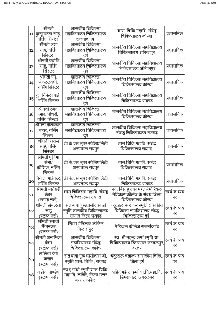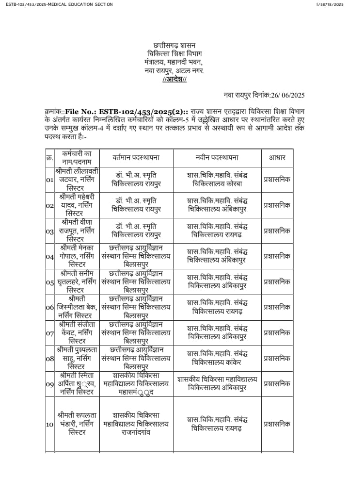 छत्तीसगढ़ राज्य शासन द्वारा ट्रांसफर की अंतिम तारीख में मात्रा दो दिन बाकी है। ऐसे में अब स्वास्थ्य विभाग द्वारा थोक के भाव में ट्रांसफर किए जा रहे हैं। जारी सूची के अनुसार स्टाफ नर्स से लेकर सहायक ग्रेड 2 तक शामिल है। बता दें कि आज शाम तक अन्य विभागों की भी बड़ी लंबी चौड़ी सूची जारी होने वाली है।